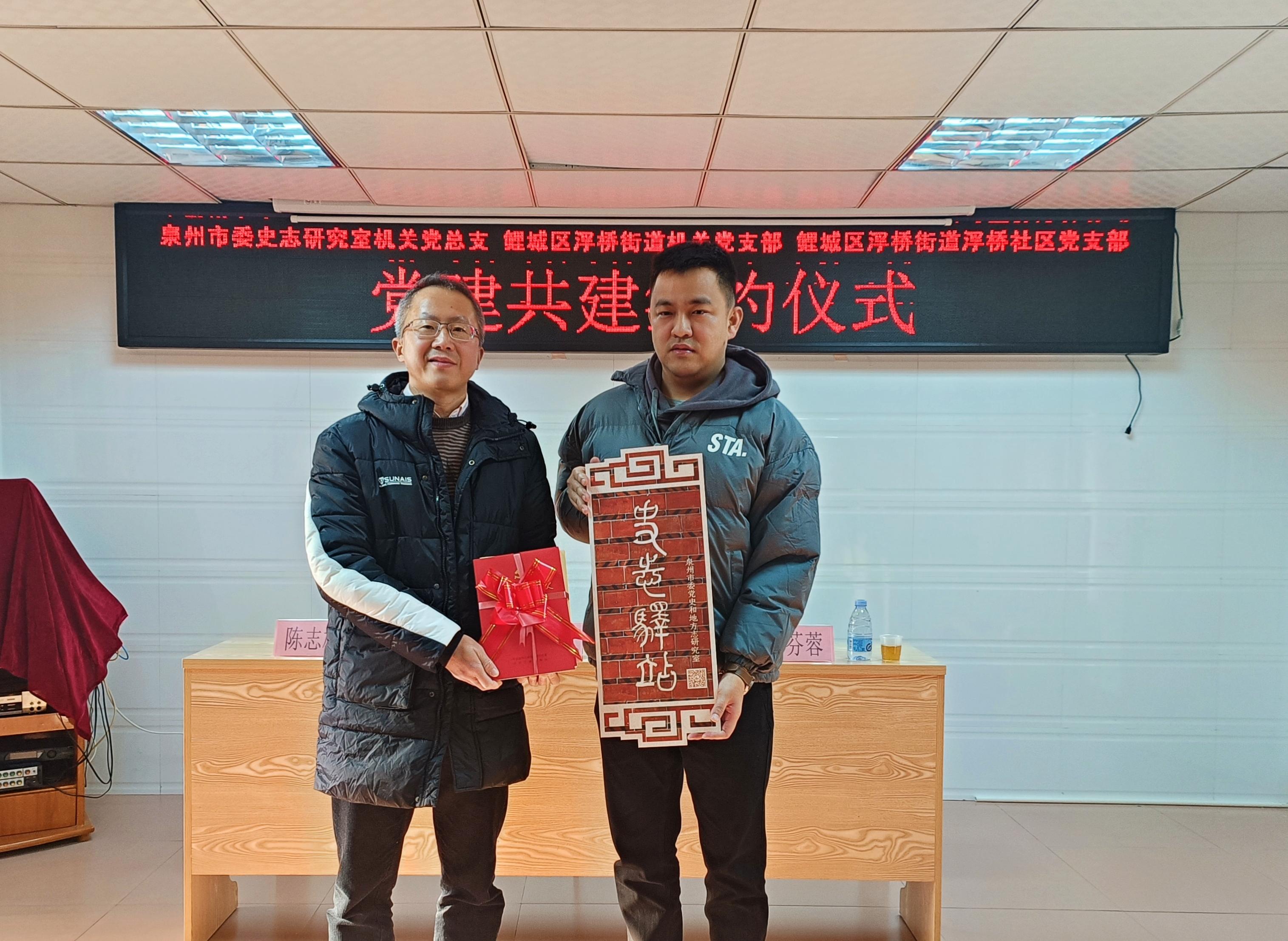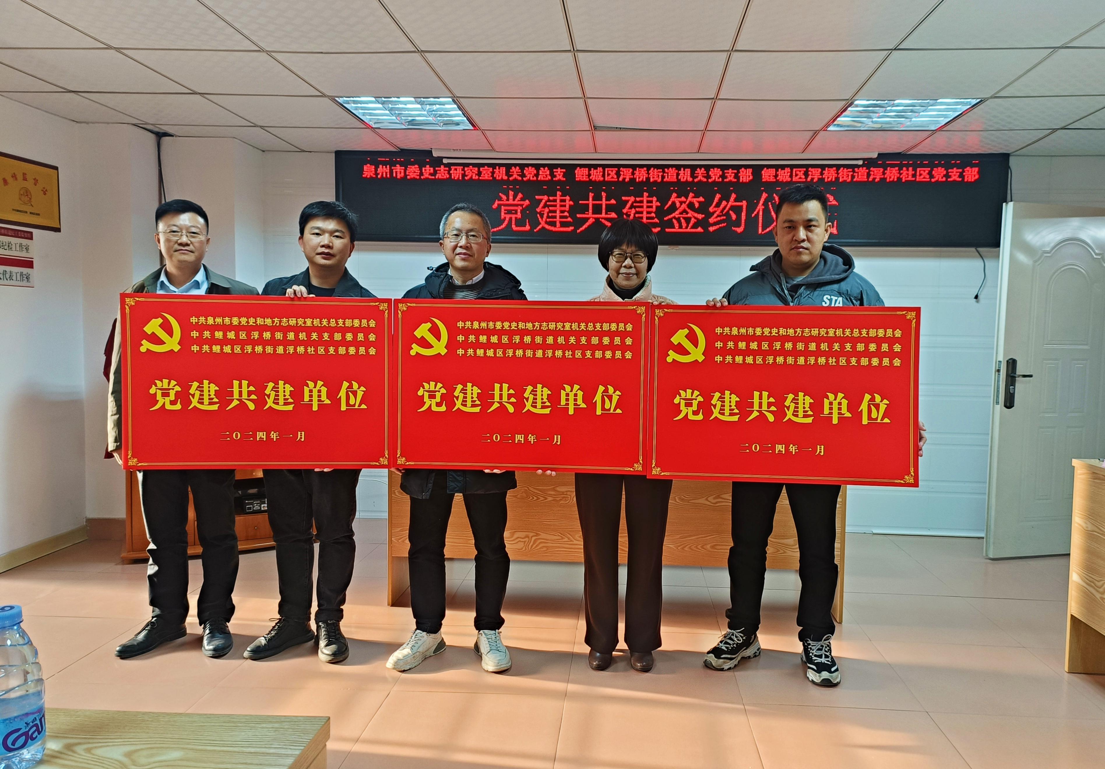 在鲤城区浮桥街道浮桥社区,泉州市委史志室机关党总支、鲤城区浮桥街道机关党支部、鲤城区浮桥街道浮桥社区党支部联合举行了共建单位授牌和签约仪式,在推进党建和业务工作相融合、史志资源服务基层发展上进行共建,进一步凝聚工作合力。
