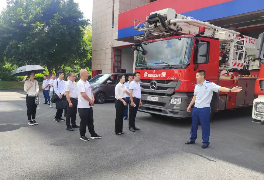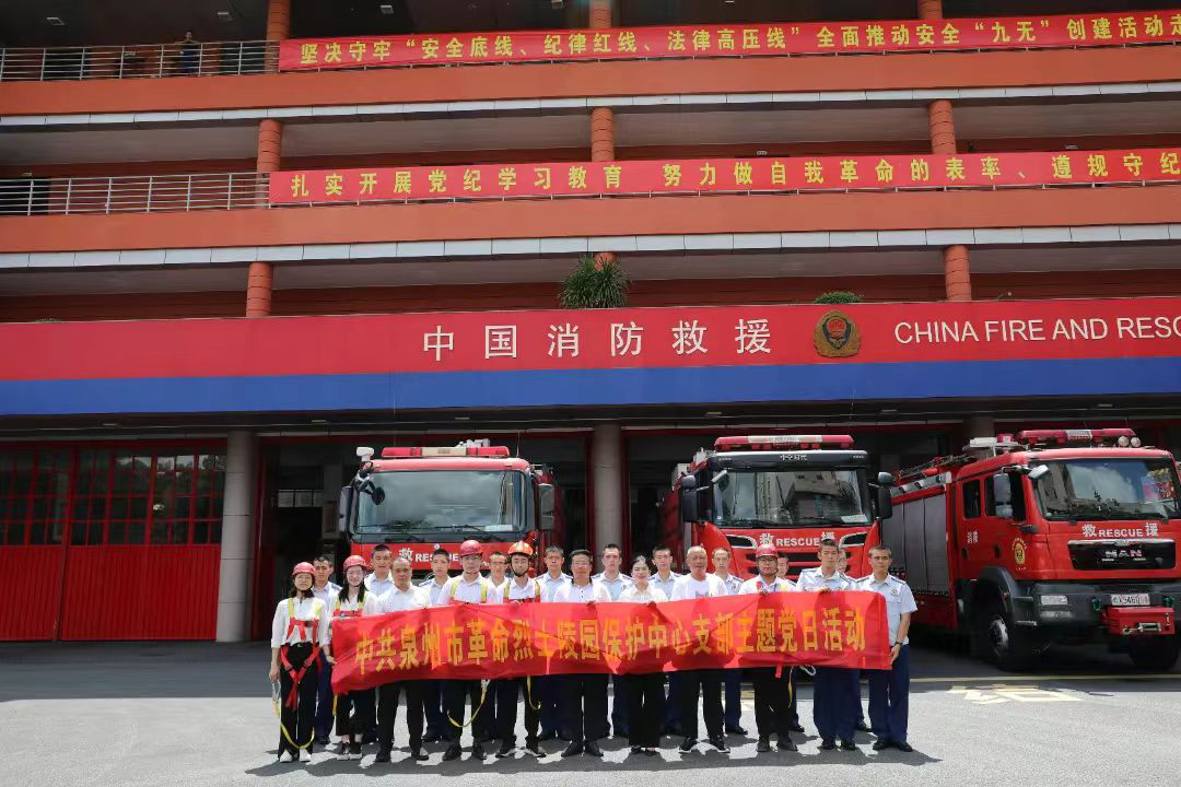 活动中,一行人首先参观了晋江市消防救援大队青阳站营区,在消防指战员的带领下,泉州市革命烈士陵园保护中心全体党员干部参观了应急救援车辆、消防器材装备等,进行实地消防演练,并穿戴防护装备登上消防云梯车,零距离体验消防员百米高空救援的不易。