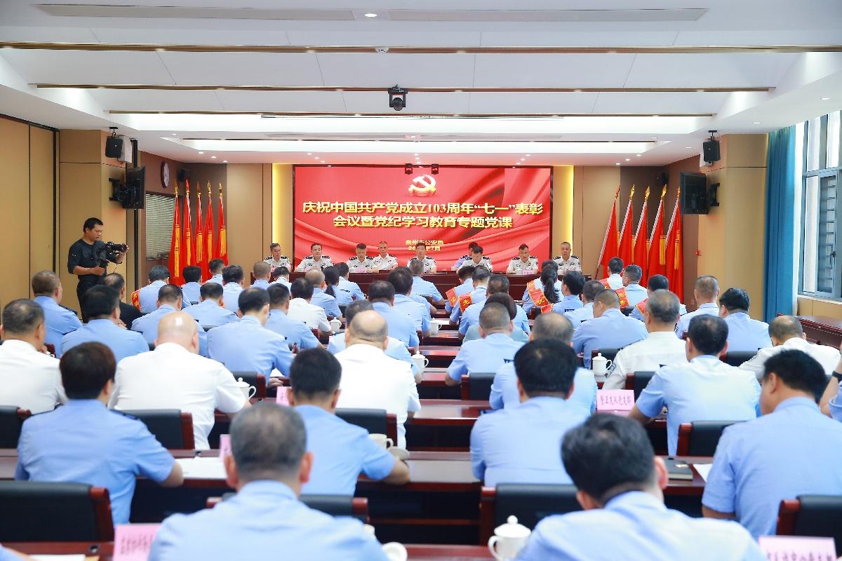 7月1日,市局召开庆祝中国共产党成立103周年“七一”表彰会议暨党纪学习教育专题党课。副市长、市局党委书记、局长肖进才参加会议,并以“坚持全面从严治党、持续深化自我革命,以高标准纪律建设保障泉州公安工作现代化”为主题讲授党纪学习教育专题党课。