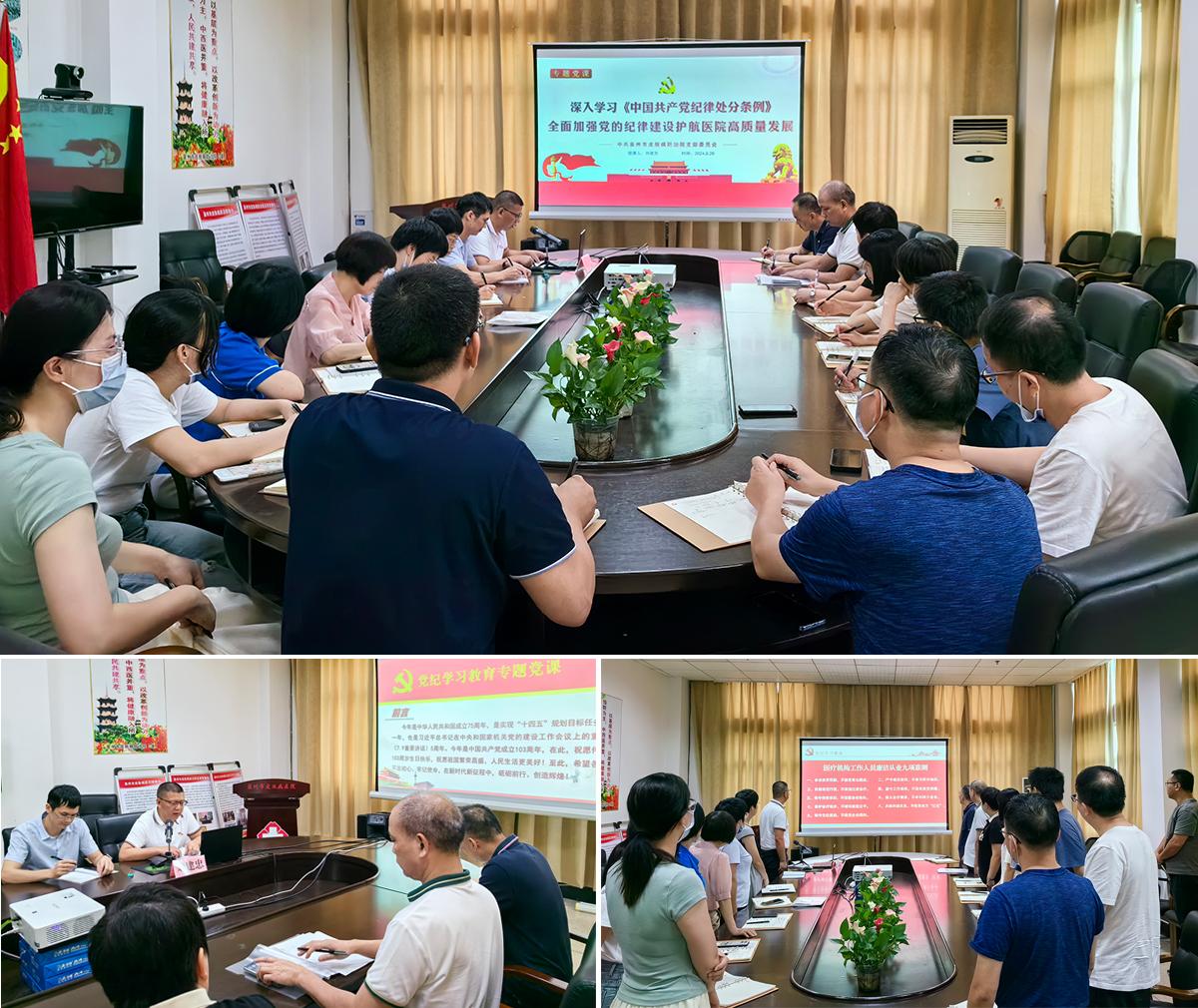 6月26日,院党支部书记刘建忠以《深入学习<中国共产党纪律处分条例>,全面加强党的纪律建设护航医院高质量发展》为题,为医院全体党员干部讲授党纪学习教育专题党课;专题党课深刻分析了修订《条例》的重要意义,重点解读了“六项纪律”中新增和修改的条文,深刻剖析违纪典型案例,以案说纪、以案说法、以案说责,帮助党员干部进一步深刻理解、准确把握《条例》精神实质,做到学纪、知纪、明纪、守纪,进一步深化党纪学习教育成果,推动全面从严治党向纵深发展,推动党风廉政建设走深走实;最后,全体人员宣读《医疗机构工作人员廉洁从业九项准则》,警醒大家始终坚守初心,恪守底线,廉洁从医。