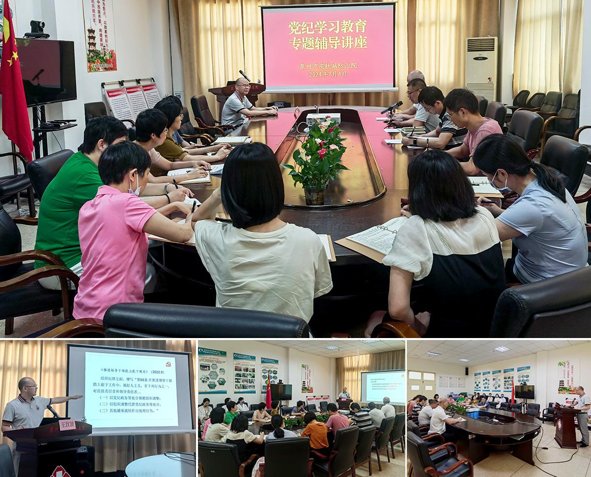 为认真开展党纪学习教育,深入理解、准确把握、贯彻执行好新修订的《中国共产党纪律处分条例》,引导医院党员干部真正做到学纪、知纪、明纪、守纪,7月4日下午,市皮肤病防治院党支部邀请泉州市委党校党史党建教研室主任、副教授王江波作党纪学习教育专题辅导讲座,医院全体党员、发展对象、入党积极分子参加。