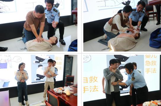 此外,现场还开展心肺复苏术急救操作演示,讲授心跳骤停的判断方法、胸外按压的位置、频率和深度,以及人工呼吸的技巧等知识,并利用模拟人教具指导干部职工进行实操练习。