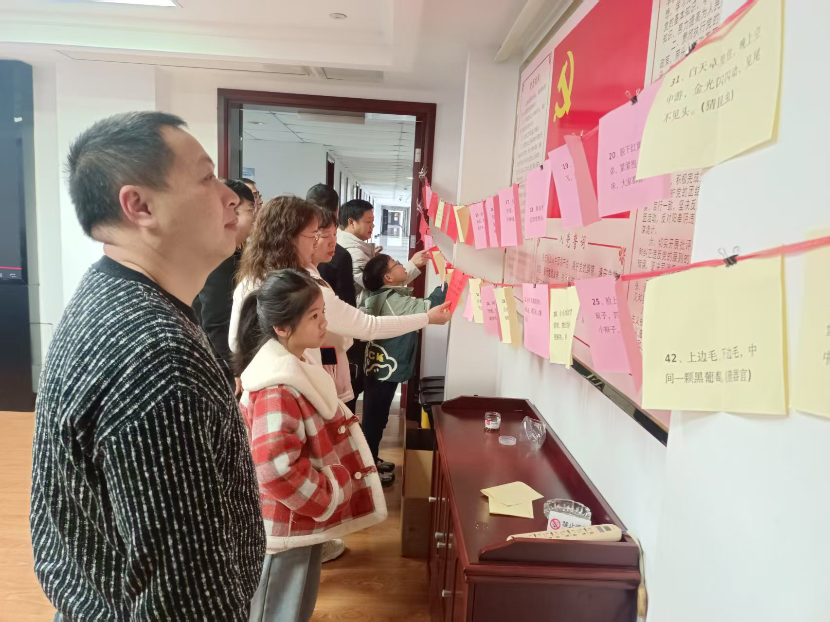 活动现场,干部职工们一同观看了元宵节文化视频,视频中,生动展示了元宵节的起源、传统习俗。通过观看视频,大家不仅对元宵节的历史和文化习俗有了更深入的了解,也深刻感受到了元宵节作为中国传统节日的深厚文化底蕴。随后,大家进入了猜灯谜环节,会议室四周挂满了各式各样的灯谜,每一个灯谜涵盖了日常生活、动植物知识等多个方面,大家纷纷踊跃参与,兴致勃勃地围在灯谜前,仔细思考谜面的含义,时而互相讨论,时而露出恍然大悟的表情,活动现场气氛热烈而欢快。