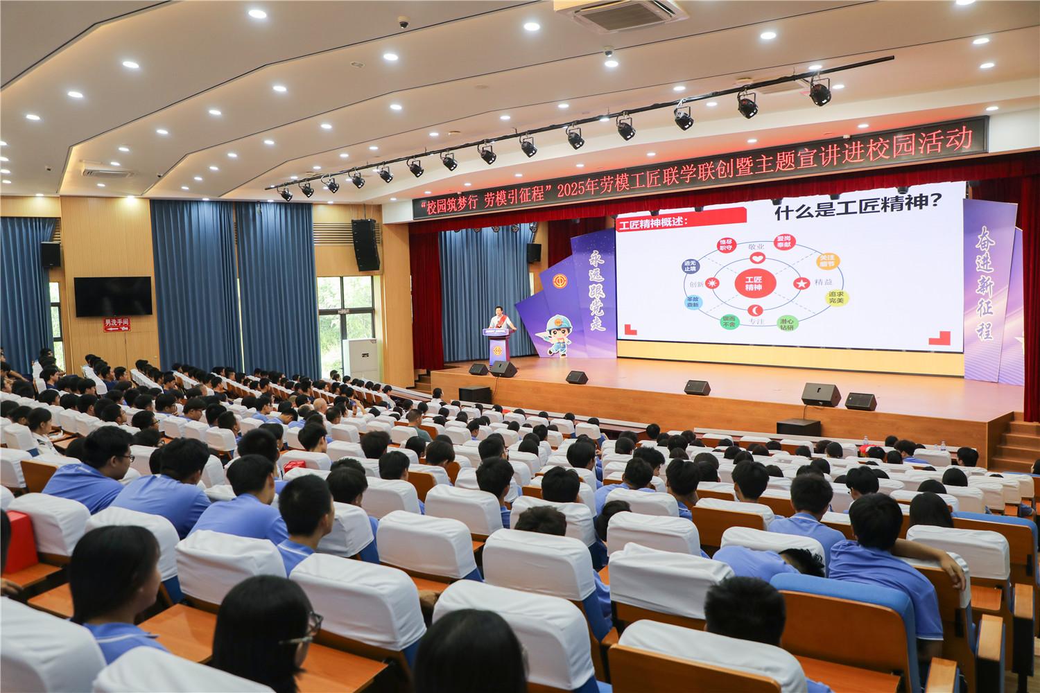 宣讲环节中,4位劳模工匠结合自身经历,用一个个鲜活故事,为师生勾勒出“匠心筑梦、技能报国”的生动蓝图。“技能是强国之基,匠心是创新之魂”……福建省劳动模范、泉州工匠叶文城分享了自己扎根工程机械制造行业30年的成长历程,他用7项国家发明专利、40多项实用新型专利的创新成果,引导学子们树立投身智能制造、服务国家产业发展的远大志向;“用工匠的精神来践行诚信,让作品说话,让口碑相传”……泉州市五一劳动奖章获得者、市诚实守信道德模范张明贵在分享中将“诚信教育”融入陶瓷文化传承与经营管理的脉络中,用真实案例告诉在场学子:唯有以诚信为基,才能在职业道路与人生航程中行稳致远;“在教学与研发中,我始终坚持让泉州味道与文化同频共振”……福建省五一劳动奖章获得者、泉州工匠张琼瑜讲述了自己三十年坚守烹饪教学与研发,为泉州申创“世界美食之都”贡献自身力量的动人故事,引导学子们以技能传承地方饮食文化、用匠心服务民生需求;“把技能练精,把人生过好,让每个零件各安其位,让每个梦想落地生根”……南安工匠刘炎发结合助力发展新质生产力主题,鼓励学子们“靠技能出彩、以匠心筑梦”,将个人理想与国家需求深度结合。