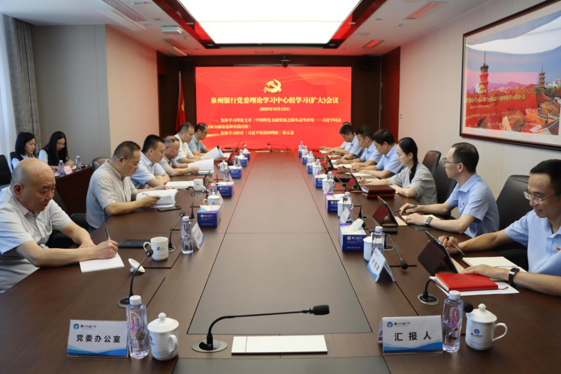 10月13日,泉州银行党委召开党委理论学习中心组学习(扩大)会议,集中学习研讨《习近平谈治国理政》第五卷。党委书记、董事长江文鹏主持会议并讲话,领导班子成员开展学习交流研讨,党委相关职能部门负责人等参加会议,市委金融办副主任林文革等相关领导列席旁听指导。