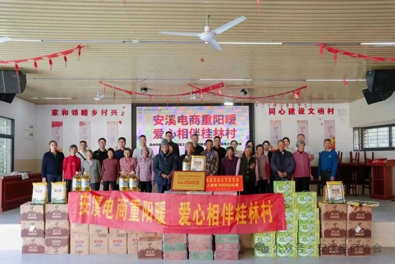 活动现场,安溪县电子商务协会向桂林村“长者食堂”捐赠爱心资金,市商务局、安溪县工业信息化和商务局、安溪县电子商务协会为高龄老人代表献上爱心慰问金和慰问品,传递祝福与关怀,让重阳佳节充满温情与暖意。