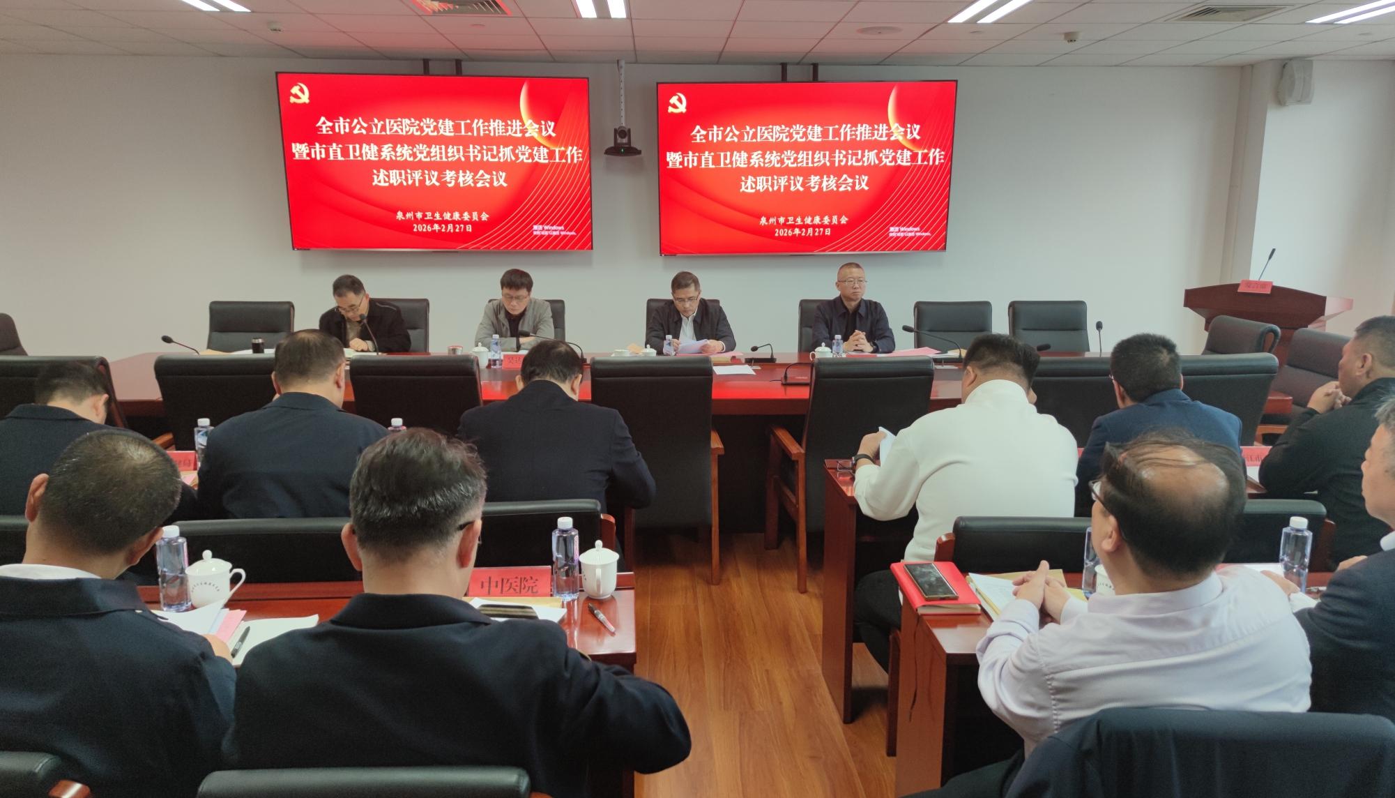 2月27日,泉州市卫健委召开全市公立医院党建工作推进会暨市直卫健系统党组织书记抓党建工作述职评议考核会议。会议深入学习贯彻习近平总书记关于党的建设的重要思想,认真落实市委、市政府关于深入开展“三争”行动的部署要求,全面回顾总结过去一年全市公立医院党的建设工作,检视评议市直卫健系统各单位党组织书记履职情况,为2026年及“十五五”开局之年的党建与业务深度融合绘就蓝图。