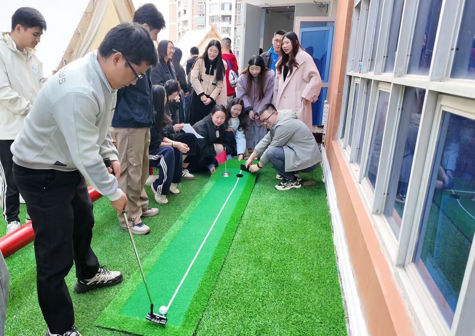 游戏过后,节奏慢了下来。茶歇时间,甜点摆台,三三两两围坐聊天,话题从工作慢慢滑向兴趣。随后的高尔夫体验和花篮DIY,把氛围推向更深处。挥杆时,有人姿势标准,有人频频失误,但旁边的鼓励声比球落得更远。插花时,有人利落下剪,有人细心配色——那些职场之外的细腻与真诚,在协作中自然流露。